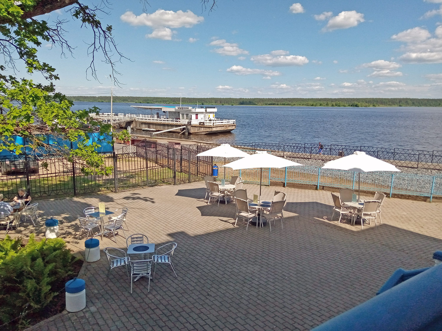 В теплое время года у нас работает летнее кафе: мы готовы порадовать вас блюдами на углях, ароматной выпечкой и прохладительными напитками в тени высокого дуба! Также рекомендуем с комфортом провести время на солнечной террасе — она оборудована детской площадкой, мангалом, удобными шезлонгами и гамаками с прекрасным видом на реку.